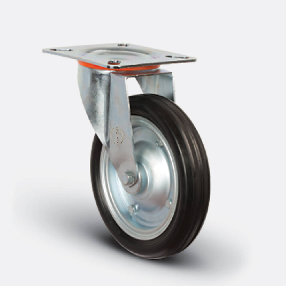 Preslenmiş çelik saç kasnak, siyah kauçuk (85 Shore A), jant kapaksız, plastik burçlu yataklı