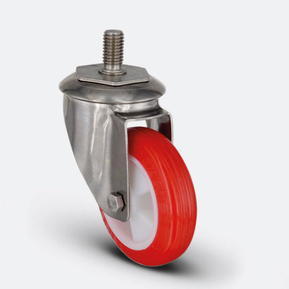Preslenmiş paslanmaz çelik saç, çift bilya yataklı, döner başlık, plastik toz koruması, civata ve somunlu teker aksı
